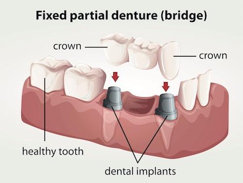 Three or more missing teeth in a row can be replaced using two or more dental implants to support a bridge. Dental bridges are made of tooth-coloured ceramic and will blend with your smile. They are fixed, so they cannot be removed, and offer an alternative to a partial denture.